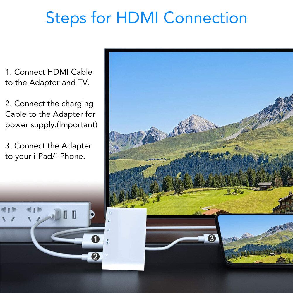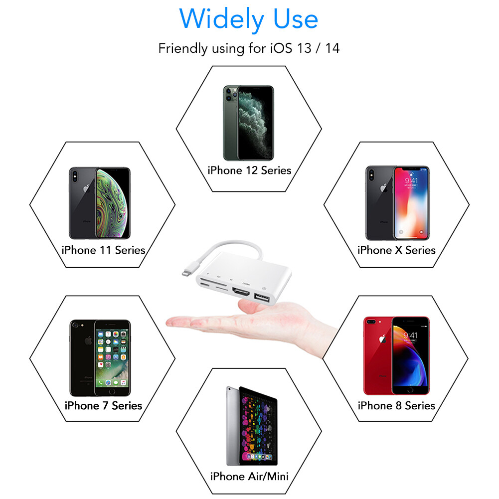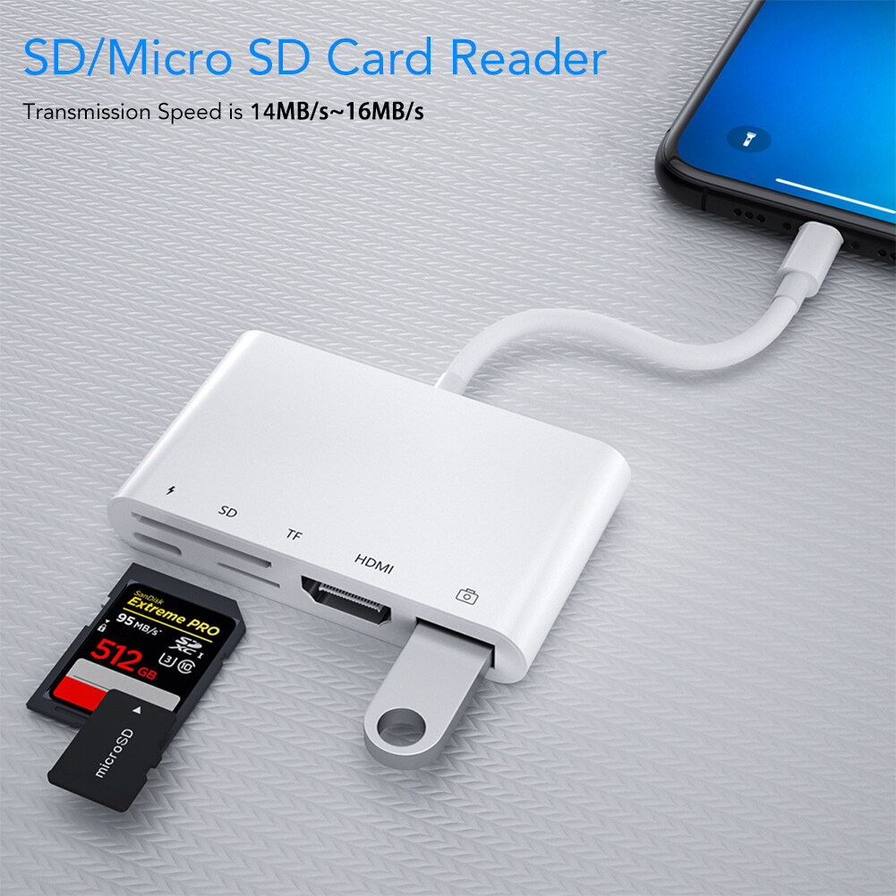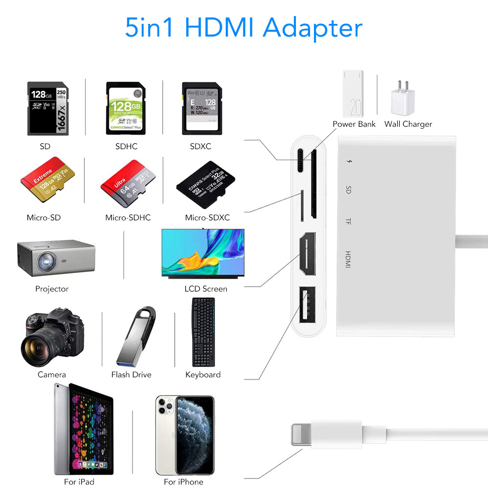 Muti-Functional adapterCharging Port: Compatible with power supply and power bank.SD/TF Memery Card Ports: SD Card port ( Compatible with SD / SDXC / SDHC / RS-MMC / MMC Micro Card ); Micro SD / TF Card port ( Compatible with Micro SDXC / Micro SDHC / Micro SD Card ).HDMI Port: Full 1080P Digital AV Adapter. With this HDMI cable Adapter, you can enjoy the bigger screen from your phones and share the happiness with your family or friends on HDTV.USB Ports: Compatible with USB disk, SD/TF card reader, keyboard, mouse, electric piano, microphone, hub. User can tranfer files or photos freely. Also, it can connect a keyboard, therefore you can type on keyboard when you are working on your pad.