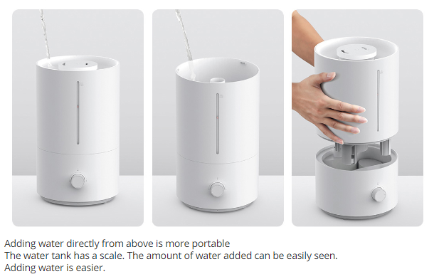 Main Features:Add water from above, easierSay goodbye to the traditional way of adding water from below, Mijia humidifier can add water directly from above. The separate design of the water tank makes adding water and cleaning more convenient.Sufficient amount of heavy fog, moisturizing all dayThe 4L large-capacity water tank is equivalent to 16 bottles of 250mL mineral water. 280mL/h strong fog volume, 10 square meters bedroom can humidify at least 9% in one hour, and relieve dryness faster. The longest humidification time can be up to 36 hours, and there is no need to add water frequently.Silver ion antibacterial material, humidification water source does not polluteThe main components of the water tank and the wading base use silver ion materials, which can effectively inhibit the growth of E. coli and Staphylococcus aureus, and the antibacterial rate can reach 99%.Light tone humidification, moisturizing does not disturbThe Mijia humidifier reduces the sound of large particles of water mist flowing and reduces fan noise, and the working sound does not exceed 38dB. The indicator light is soft and without halo, and it is not dazzling in the dark. Low noise, good sleep, comfortable sleep and moisturizing all night.Refuse to wet the table, the humidity is only in the airThe high-frequency ultrasonic atomizer vibrates 1.7 million times per second at high speed to break up water particles. The built-in baffle blocks the large particles of water, leaving only the fine water mist directly into the air through the oblique straight air duct, and the water mist is ≥50cm from the table.Large diameter designThe upper mouth of the Mijia humidifier has a diameter of 14cm, and the open mouth is easy to scrub. The sleek and delicate internal structure reduces the dead spots that hide dirt. The water tank is light and easy to lift, making cleaning more labor-saving.Double protection systemAfter the water tank is lifted, humidification is stopped. When the water source is exhausted, the machine does not dry and the orange indicator light reminds the lack of water. Double protection makes humidification safer.Stepless adjustment of the amount of fog, choose as you likeLow fog volume | Middle fog volume | High fog volumeSmall, it can be placed anywhereSmall space water storage boxReduce water storage, reduce bacteria breeding environment, humidify safe and cleanWaterproof membrane grooveBalance the air pressure of the water tank to prevent the machine from stopping workingUltrasonic welding technologyImprove product tightness and reduce the possibility of bacterial survivalSemi-closed air inlet gridReduce the possibility of internal moisture and extend product lifeNote:CN power charger charging, delivery needs to match the corresponding country adapterParameters:Rated voltage: 220V, 50HzRated power: 17.5WNoise: ≤38dBCaliber: 14cm