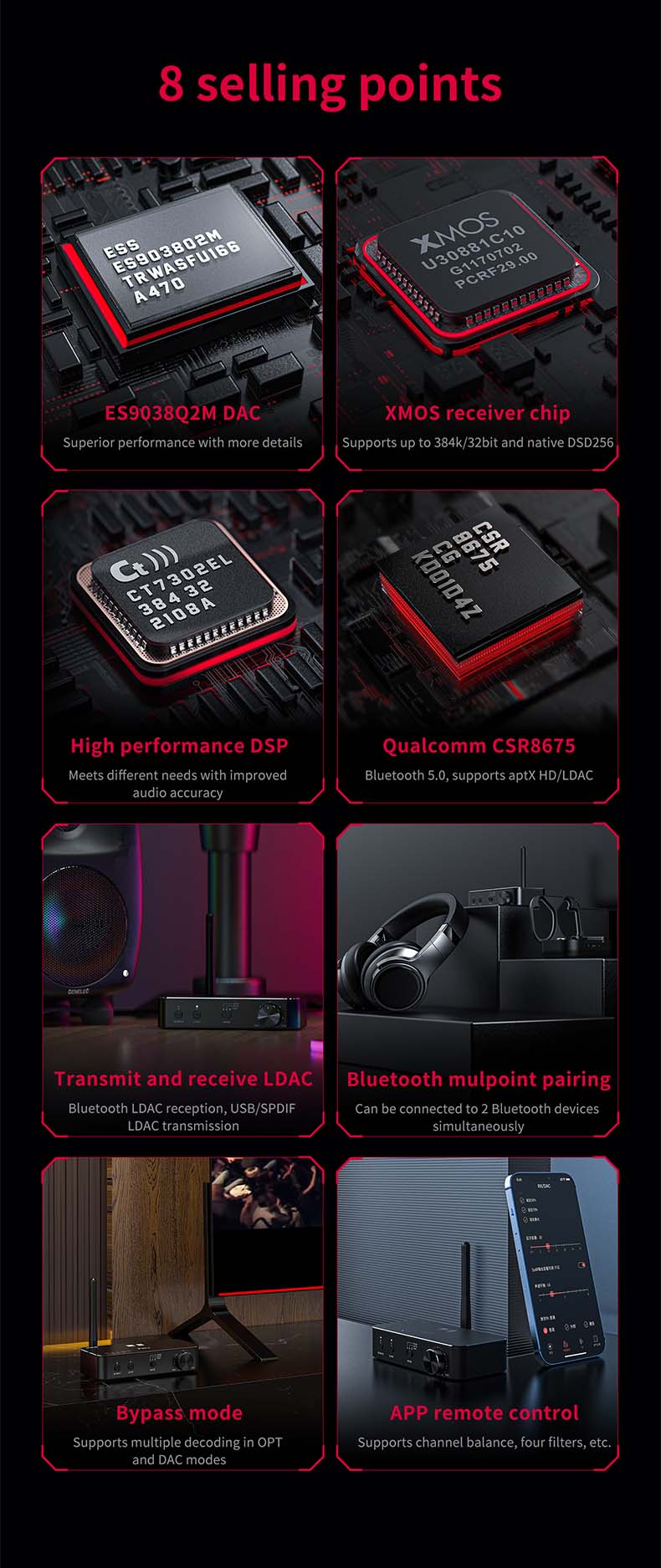 >FiiO has featured Qualcomm's highly-trusted CSR8675 Bluetooth processor chip on the BTA30 Pro. BTA30 Pro provides a seamless wireless Bluetooth transmission with high-resolution LDAC codec support in both transmission and receiving stages. The devices truly untangle us from the burden of wires by making us go wireless in the input signal department.