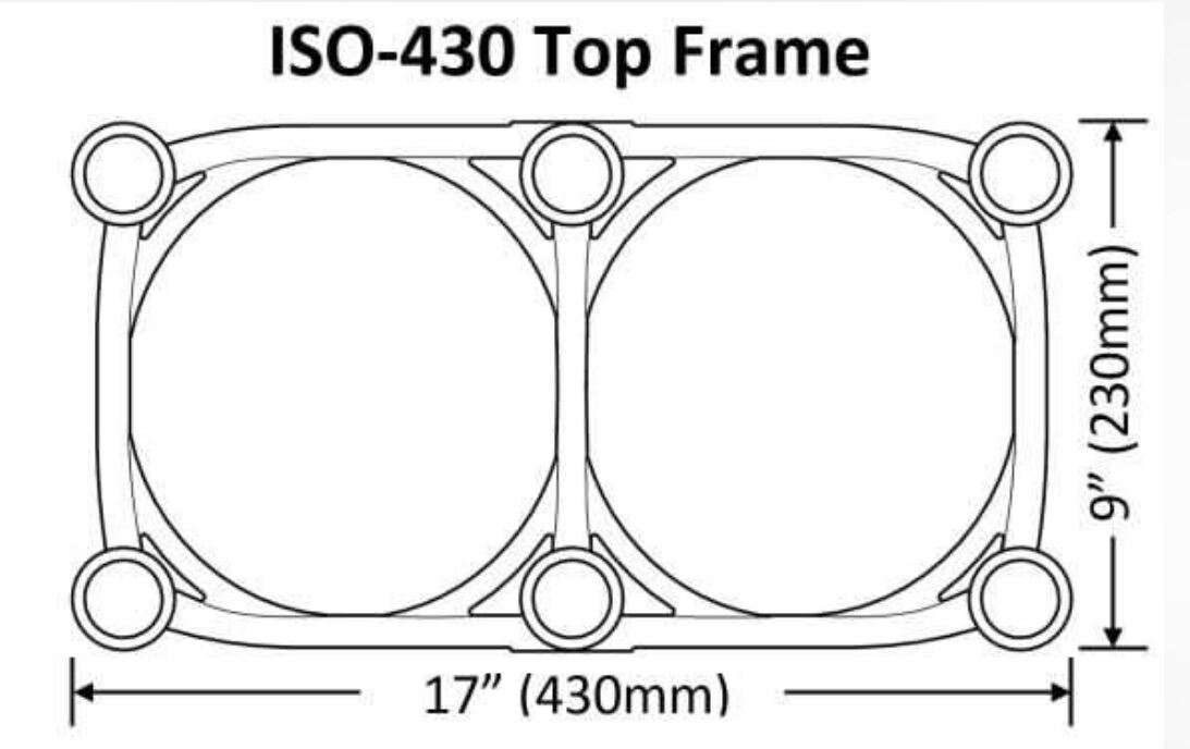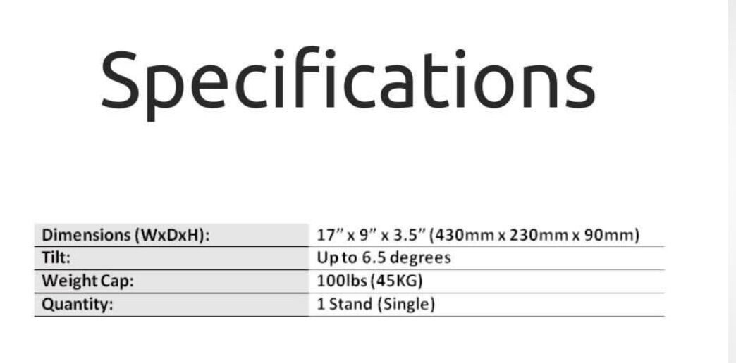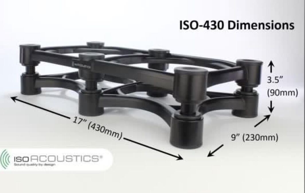The ISO-430 isolation stand is 17" (430mm) wide x 9" (230mm) depth and is designed for Studio Monitors, Guitar, Bass and Other Instrument Amplifiers weighing up to 100 lbs.