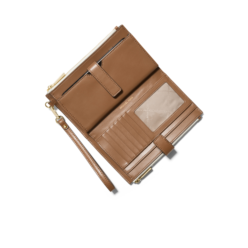 Crafted from Signature-print canvas, this wallet has two zip sides that unfold to reveal a center with pockets for all the essentials—from credit cards to your smartphone. A detachable wristlet strap makes it versatile enough to carry alone or in a tote.