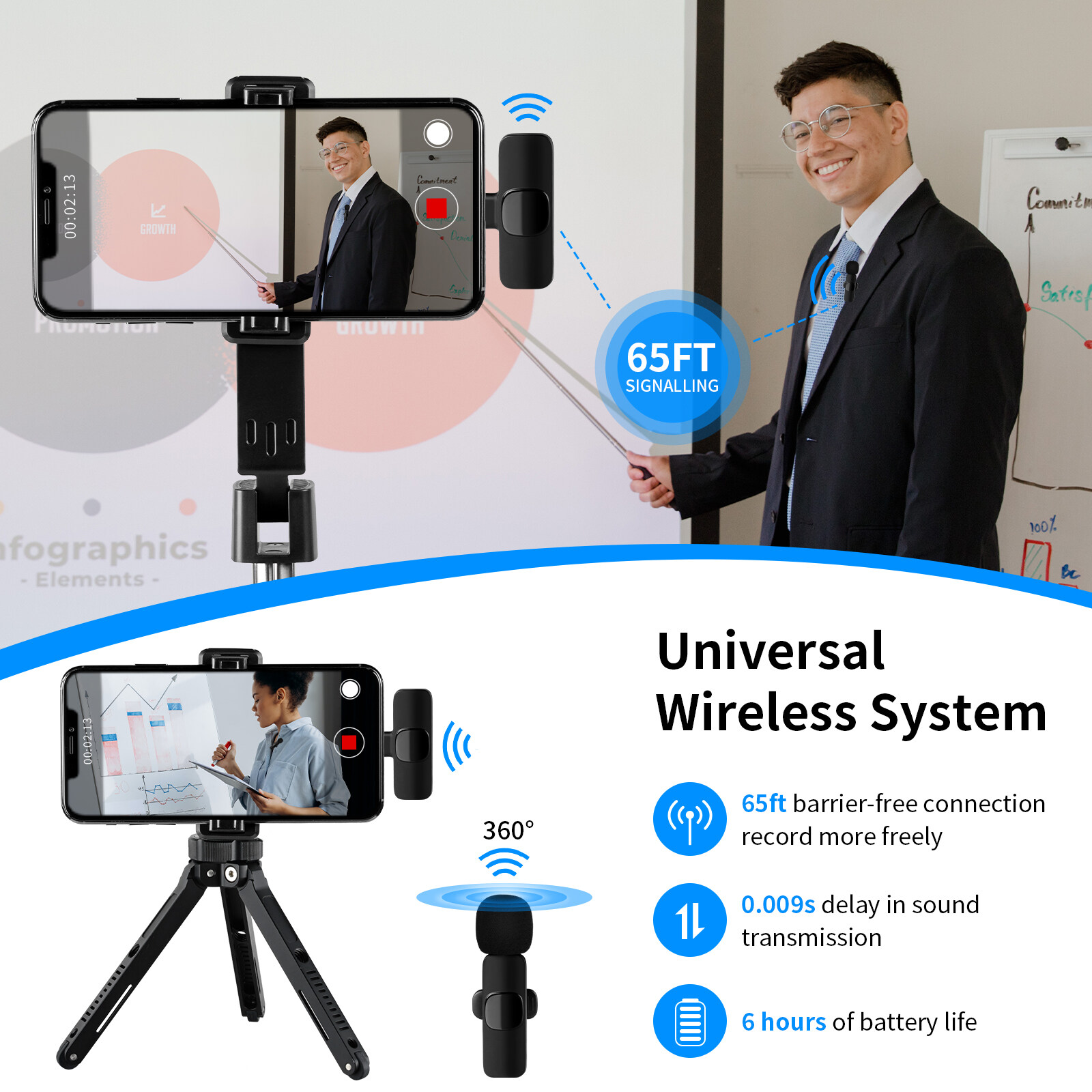 【Connector with wide Compability 】- The wireless lavalier microphone can work with all iPhone , Type-C connector Phone , iPad , Pad, Table.