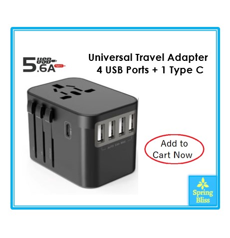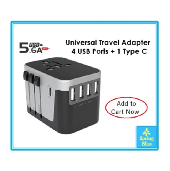 [SG Seller] Universal Travel Adapter All in One International Worldwide Wall Power Travel Adaptor with 4 USB Ports + 1 Type C Port Fast Wall Charger Plug (Black/ Black with Dark Grey/ Black with Silve
